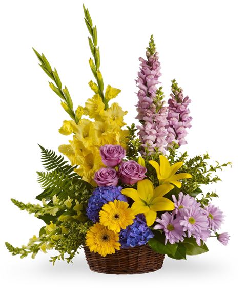 in cesto di vimini con gerbere gialle, lilium gialli, rose lilla, ortensie viola, margherite rosa, gladioli gialli e bocchedileone rosa in altezza, con verde decorativo.